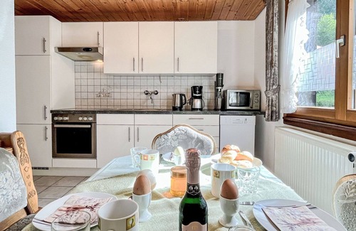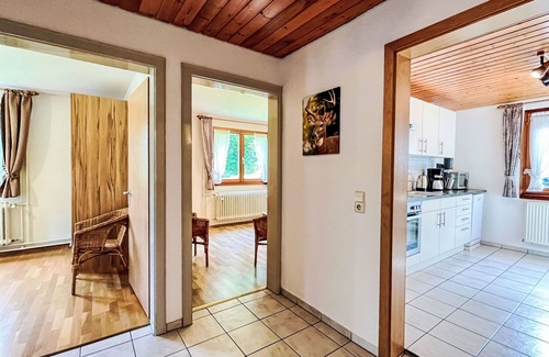 This 2-family house "Kaiser" is a 2-story vacation rental surrounded by trees and meadows in the district of Eisenbreche, just 5 km from the center of Schluchsee. It boasts a sunny position, nestled 200 m from the forest edge, 900 m from the lake, and 15 km from the skiing area. The property features a yard, internet WiFi, and parking.