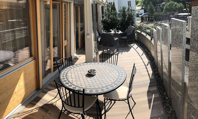 55 m2. More information by the provider: Very stylish, bright and beautiful 2-room apartment (approx.55 m2) on the ground floor of an apartment house. Ideal location in the centre near pedestrian zone. The apartment is modern and first-class furnished and offers a double room with own TV, a living room with pull-out sofa bed (140 cm), TV and free Wifi. The open kitchen is fully equipped with dishwasher and coffee machine. Modern shower/WC. Large terracewith garden furniture. Parking space in garage included. Ski and ski boot room. NON-SMOKING APARTMENT. Pets allowed (except in bedroom).