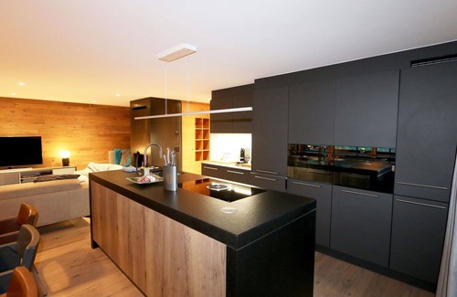 145 m2. More information by the provider: Newly built house Derby is located in the center of town right on the ski slopes (ski-in/out) and in proximity of many popular restaurants. Located on the top floor (elevator available), the Derby penthouse apartment (*****) is a sleek and modern apartment for up to 4 people. It features a master bedroom and a twin bedroom, both bedrooms with en-suite bathrooms (rainfall shower, WC, sink, hairdryer). The apartment has an open kitchen with dining area, living room with fire place and flatscreen-TV. The kitchen is fully equipped with dishwasher, combi-microwave, oven, Bora induction stove, coffee machine, toaster, kettle, cheese fondue set and raclette oven. Panoramic views from the private balcony and wireless internet available. The apartment is non-smoking and no pets are permitted. Private and heated ski storage facility is available in the building. Laundry room with washer and dryer is available in the building.