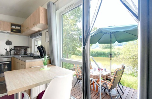 You will find the "Tiny Haus Angelika" to be a cozy 2-room mobile home, spanning 25 square meters. It is suitable for accommodating 2 adults and 2 children comfortably. The living/sleeping room features a sofabed (120 cm wide and 170 cm long) and a satellite TV, allowing you to unwind after a long day of exploring. This room also provides access to the terrace. Additionally, there is a separate room equipped with a French bed (140 cm wide and 200 cm long).