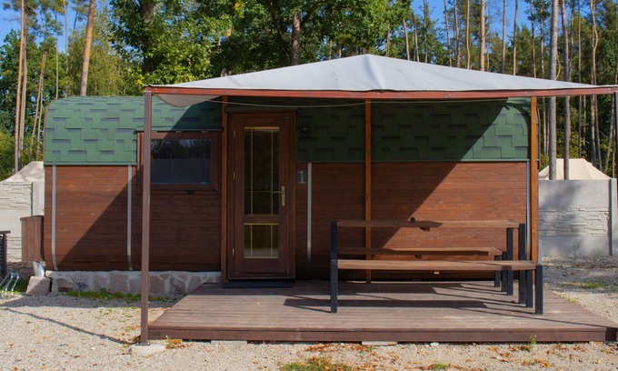 Child friendly holiday village "Kemp stříbrný rybník". 25 houses in the resort. In the district of Malšova Lhota, 5 km from the centre of Hradec Králové, along the wooded area, on the lake. For shared use: property. Table tennis, boccia (extra), beach volleyball, arbour, barbecue, fireplace, children's playground, bathing jetty. In the complex: reception, restaurant, bar, bistro, playroom, washing machine (for shared use, extra). Parking on the premises. Sandy beach, natural swimming pond 10 m. Sports harbour, minigolf, sports centre, walking paths from the house, cycle lane, fishing possibilities 10 m. Nearby attractions: Adventure park Firmsport, Gladiator race arena, letní kino, tutistický vláček do lesa, Stezka siluet, Rytířské hradiště 3 km, Park Na Větvi 3 km, Obory se zvěří 4.2 km, Obří akvárium, Botanická zahrada 4.7 km. Hiking paths: Pohádková, Vodnická stezka 6 km, Planetárium, planetární stezka 8.4 km, Zoopark Stěžery, Rozhledna Milíř 15 km. Please note: entertainment in the season. Suitable for families. Fishing [permit required]. The photograph shows a typical example.