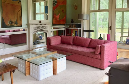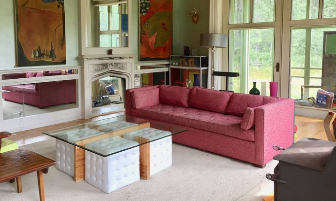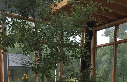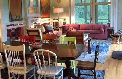 This beautiful, open house is very private and peaceful and has huge windows all around to enjoy the views of nature. The kitchen is great to work in and has a huge island, and is open to the dining room and living room, and to the glass-roofed porch. It is perfect for a family who wants time in nature or an individual who wants a retreat to write or work.