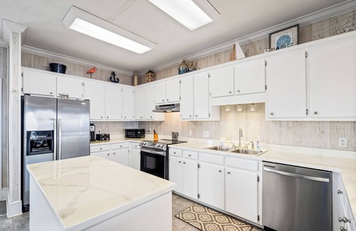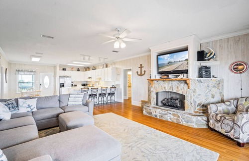 036 Island Time- LEVEL 2 TESLA CHARGING AVAILABLE AT THE HOME -Perfect water-front home for two families! Serene Island Time has it all. With sound system speakers on both decks, you can enjoy your favorite music while experiencing canal and gulf views from the front, or the sweeping, unobstructed views of the Mississippi Sound from the back deck. The open-floor plan features a spacious, well-equipped kitchen. Ten can dine utilizing the four bar stools at the counter adjacent to the six-top dining table. The living room sectional gathers your family around a substantial stone mantle. The East side of the house offers a Master bedroom with a queen bed, tv and dvd player, and a 2nd bedroom with a twin bed and twin bunk beds, cleverly stocked with toys, games, and kid equipment. The shared bath on that side has a tub/shower combo. The west side also offers a bedroom with a queen bed and tv/dvd player, a hall bath with a tub/shower combo, laundry room, and fourth bedroom with two twin beds. You�ll appreciate the modern, nautical d�cor and accommodating extra touches of this home.