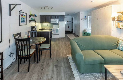 This newly renovated studio unit is located on the ground floor, literally steps from the beach & the lake. The unit features a very comfy queen-size Murphy bed (let the sound of the waves lull you to sleep!), sofa, dining table & chairs, fully-equipped kitchen, full bath, and a private patio for dining al fresco with views of the lake! Non working fireplace. Ornamental only. Everything has been recently renovated and full of artful touches and modern conveniences.