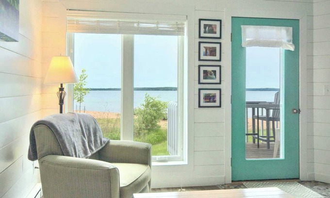 You'll love this fully renovated studio condo that is literally steps from the beach! This unit is bright & airy with modern decor and all the thoughtful touches that make this the perfect place to serve as home base for your escape to Bayfield. The unit may be compact, but it is fully featured and oh-so-charming! You'll enjoy a full kitchen, dining area, comfy couch and side chair, queen-size bed, and a beautiful full bathroom. Not to mention your own patio overlooking the lake and the beach!