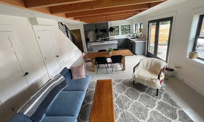 Enjoy the sun-drenched rooms, the architectural finishes and the french doors opening to your private and fully-fenced garden. Beautifully designed, this cottage features polished concrete floors, a gas fireplace, and a contemporary & inviting kitchen with island. High ceilings upstairs with a full bath and two generously-sized bedrooms. Primary bedroom with queen bed plus table/desk, second bedroom with single bunk bed over a queen sized bed. Centrally located near Greenlake, Ravenna, UW, biking & jogging paths, Roosevelt light rail station, great local cafes and shopping.