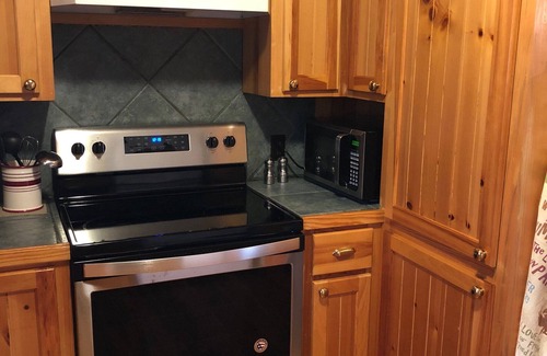 The living room has a comfortable sofa with chairs. The sofa is also a full/queen size pull out bed with linens stored in the chaise. There is a TV and a DVD player as well as several board games for a fun evening. Many tourists brochures of the area and hiking trail maps can be found behind the sofa in the living room.