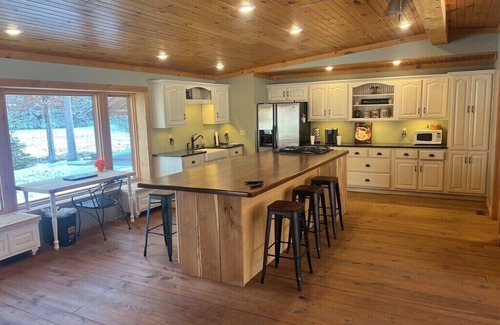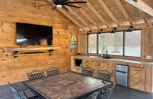 Surrounded by three ponds and a creek, this cabin in nestled in the woods and a beautiful place for a quiet get-a-way. You can enjoy fishing off the deck or around the pond. There's a shelter with an outdoor kitchen and a bonfire area. Open concept kitchen and living space with a wood burning stove, spa-like bathroom and one bedroom with a king size bed. Up to two small dogs welcomed.
