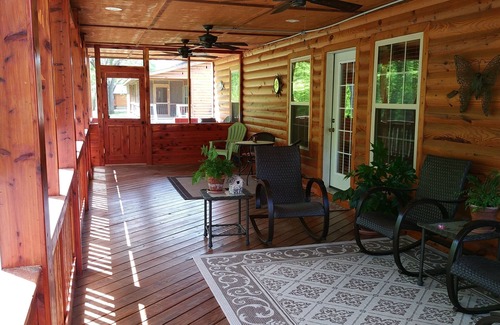 Situated in a beautiful valley, this cozy cabin backs up on the White River at the point across from the spectacular Handford Bluff. The cabin has a fully accommodated kitchen and laundry room for longer stays. The cedar wrapped, 40 foot back porch is screened and has four ceiling fans for your comfort in the summer and a small unscreened area with a charcoal grill. There is a fire pit in the back yard.