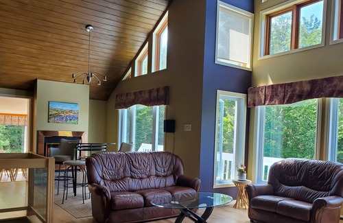 Enjoy a comfortable and spacious four season chalet Sapphire with three wood fireplaces and a hot tub . Chalet Sapphire is situated on a beautifully forested hillside with an exceptional view .Situated a few steps away from Parc Doncaster(dog friendly) which offers fishing , a picnic area , hiking, walking trail activity, snowshoeing, cross country skiing .15 minutes away from 4 ski hills which are Mont St-Sauveur, Mont Gabriel,Mont Olympia, Chantecler and Mont-Tremblant area.