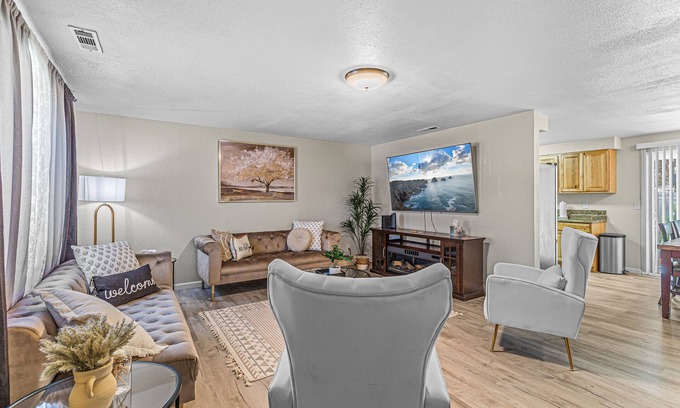 This 3-bedroom, 2-bath house features a cozy queen bed, dresser,tv, and closet in each room, with the master bedroom boasting an en suite bathroom. There is a spacious front yard with on-site parking, and a peaceful, relaxing backyard.