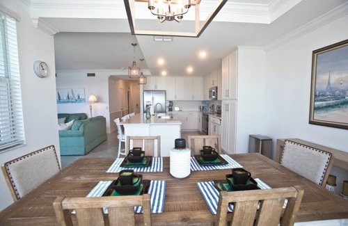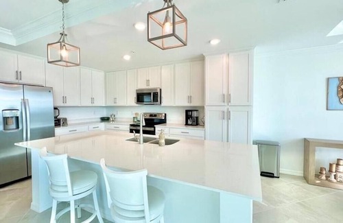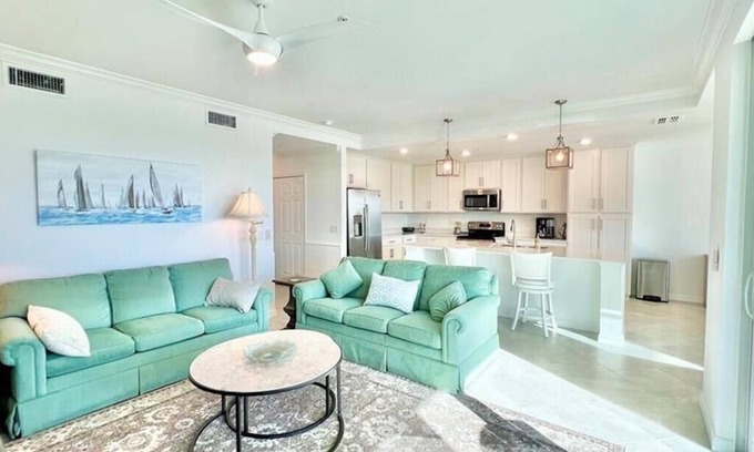 Discover our stunning 2-bedroom, 2-bath condo, featuring a luxurious master suite with a king bed and a cozy living room equipped with a 75-inch HD smart TV. This serene space offers relaxation and resort-style amenities, including year-round swimming pools, tennis, pickleball, and optional golf access.