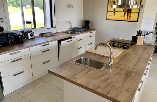 New contemporary house with garden of 615 m2 in a dead end in a quiet subdivision, 2 or 3 private parking spaces in the paved driveway leading to the garage. Beautifully decorated house, 10 minutes from the beaches on foot, in the charming seaside resort of Pouldu, with its wild beaches and coastal paths. At 20 m at the back of the house hiking trails and mountain biking. House very comfortable and bright with large windows, a very spacious and friendly kitchen with central island of 2. 20 m long 2 sinks, you can cook with friends with ease. Roof terrace very nice with its wicker garden furniture braided to relax or have a snack with friends and family. Sea and countryside view.