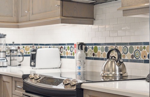 There are three bedrooms downstairs and one upstairs which will sleep a total of eight. The downstairs master bedroom suite has a king bed and attached bath with dual sinks and recently updated shower. There are also 2 bedrooms, one with a queen bed, the other with twin beds, downstairs that share a full bath, recently updated with tub and shower. The upstairs includes another master suite which also has a pillow-top queen bed, a private balcony, and an attached private bath with shower. Plush bed and bath linens are provided in all bedrooms.