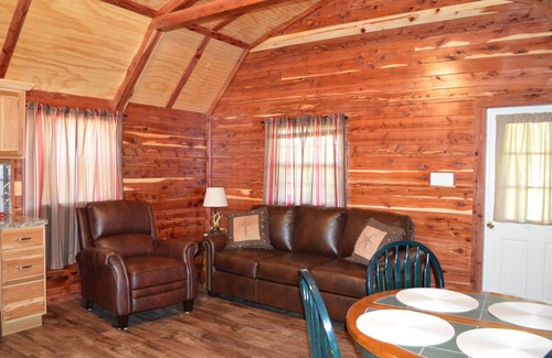 Beautiful rustic cozy cedar cabin with large deck within walking distance of Rocky Top Winery. This cabin is equipped with full size appliances in the kitchen, king size bed and queen sleeper sofa. You have your own fire pit with charcoal grill and views of wildlife from the deck. We have a large fishing pond that is stocked with catfish and bass that all guest are welcome to fish. Guest receive a complimentary bottle of wine and a dozen homemade cookies and are welcome to come enjoy the winery and experience a free wine tasting. We are located on a dead end road at the end of the road so we are very secluded. Each cabin has it's own private yard for the guest to enjoy.