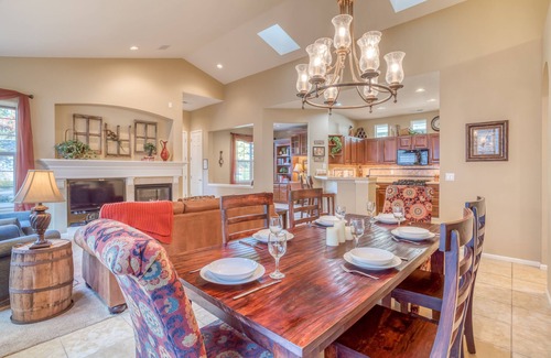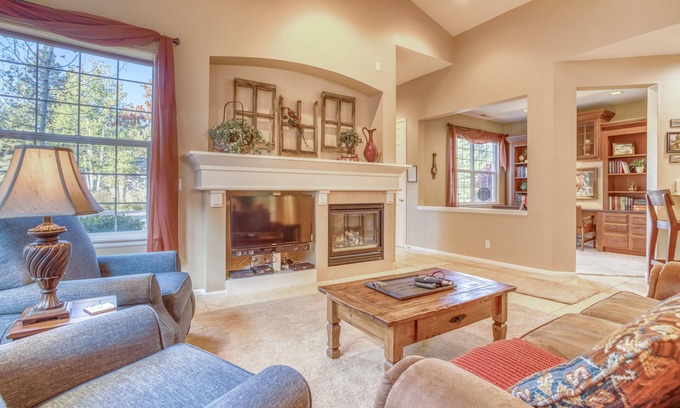 You’ll enjoy peace and quiet in this desirable Westside home in The Parks, an exclusive neighborhood with its own community parks and pool. But you’ll also love its proximity to all the activities you want to access in your visit to Bend: rafting the Deschutes River, golf at Widgi Creek or Tetherow, hiking, biking and horseback riding are minutes away (Mt. Bachelor is a mere 25-minute drive). You can walk a mile to the Old Mill District for shopping and dining, or twelve blocks to the Les Schwab Amphitheater for summer concerts. You’ll enjoy air-conditioned comfort and relaxation in the great room of this beautiful home with its gas fireplace and large flat-screen TV. The dining table and fully equipped kitchen with gas range assure you can eat in if you choose; and outdoor patio with cafe table and barbecue mean you can dine outdoors as well. Two bedrooms, one a king primary suite with a large walk-in shower, plus a bonus den with a library and workspace give your guests plenty of quiet space. Enjoy a swim after dinner, a glass of wine on the patio or a stroll along the Deschutes from this pretty, conveniently located retreat after a day of exploring all Bend has to offer!