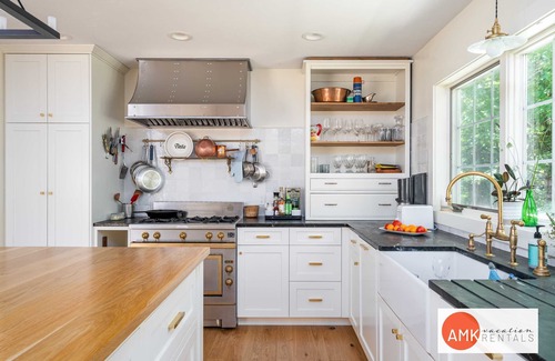 The bright open concept main floor with salvaged wood frame beams is the perfect place to relax, cook, or read after a long day at the beach, or in front of a fire on a wintery night. The large chef's kitchen is bathed in natural light and features all new, high-end appliances including antiqued brass French La Cornue gas range and Zephyr hood vent. The large island fosters long conversations and fun over meal prep.