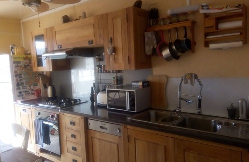 Modern and equipped kitchen, "cosy atmosphere" like the mountain chalets. Large balcony with sofa to sit and small table.