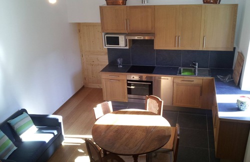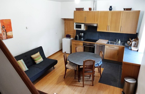 On the ground floor a fully equipped kitchen (plate 4 induction hob, oven, extractor hood, microwave, fridge, toaster, coffee machine, vacuum cleaner, plenty of storage space, a round table, 4 chairs, low buffet, convertible 1 nobody.