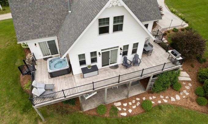 Views of Grand Traverse East Bay with the privacy of 10 acres and minutes from downtown Traverse City or Elk Rapids. Home was completed in June of 2017 and is located near GLEF, Turtle Creek Casino, Golf, Lake Michigan, Elk Lake, Torch Lake, hiking and biking trails and wine tours. 2 miles from the Flintfields Equestrian Festival. Enjoy the gorgeous sunsets while relaxing on over 600 square feet of wrap around deck. Home is warm and inviting with plenty of space for the whole family. Large open kitchen, dining, and living room. Pets okay! New for 2024 is a Ring Camera near the sunroom entrance facing the driveway to ensure ease of communication should you have any questions.