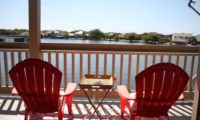 This beautifully decorated condo is a great place to relax and unwind for family fun, a romantic weekend, or a great girls get together. This two bedroom, two bath condo has crown molding, tongue & groove ceiling and plank tile flooring throughout, and is located on the 2nd floor. It has a spacious master bedroom with a King bed with 400 thread count linens, dresser, two night stands, flat screen TV, and a private bathroom. The charming nautical themed second bedroom has a queen bed with 400 thread count linens, two night stands, small dresser, large walk in closet, flat screen TV, along with attached Jack and Jill bathroom. The kitchen, dining and living area are all open to each other and provide a cozy gathering place for meals and just hanging out taking in the lake views. The balcony located off of the living room is a great place to begin your day with your morning coffee, or to toast the end of a great day at the lake with a bottle of Texas wine.