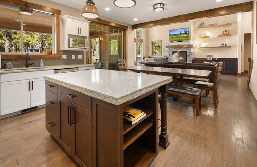 You and your guests will love relaxing in the large, comfortable great room appointed with a ledge stone gas fireplace, huge flat screen TV, and soaring 25’ vaulted ceilings. The elegant granite and stainless steel kitchen is fully stocked for you to make fantastic in home meals. The dining table seats 14 with additional seating for 3 at the kitchen island.