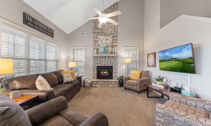 We are located just outside of Branson, Missouri in the gated golf community of StoneBridge Village nestled in the foothills of the Ozark Mountains. Stonebridge Village is located on 3,200 acres and features the Ledgestone Championship Golf Course. Offering 3 swimming pools, 3 playgrounds, 3 tennis courts, walking trails, a catch and release lake, basketball court, sand volleyball court, and an on-site restaurant. When you rent this villa you will have access to all of these amenities.
