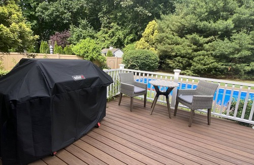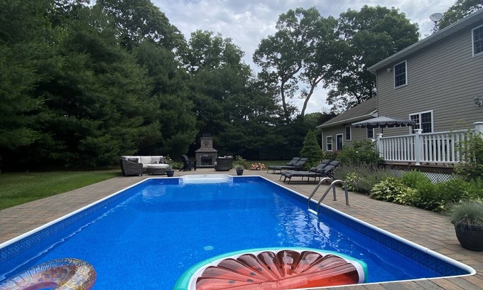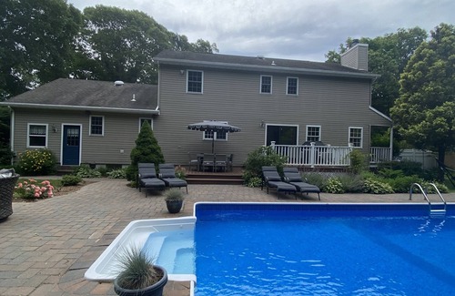 Beautiful private house and grounds, perfect for fun and relaxation! This 4 bedroom, 2.5 bath home is fully equipped inside and out! Outdoor features a heated pool, outdoor wood burning fire place and two level deck with a BBQ and plenty of sitting and lounging space. Indoor features a living room with a bar area, family room with a wood burning fire place, work station and dining room. The whole first floor has an open layout. Game room in the basement includes two separate tables of pool and ping pong. Front yard has a lovely deck with rocking chairs. You may not want to leave!