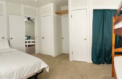 Picture yourself in Bedroom 1, a cozy haven with a plush queen bed and charming bunk beds, perfect for family bonding. Bedroom 2 offers a tranquil retreat, featuring a single bed for a peaceful night's rest. For additional guests, the living room's sleeper sofa is a dreamy respite.