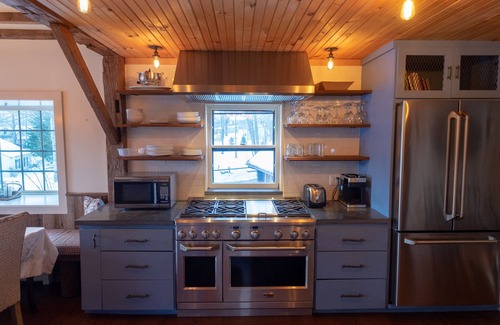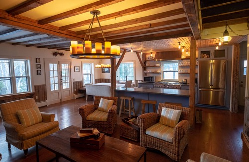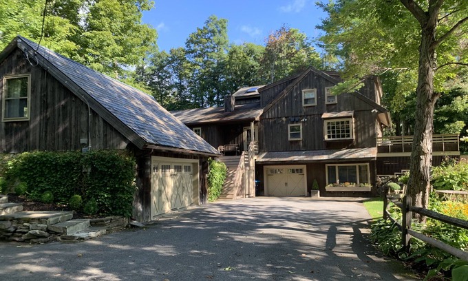 Welcome to your home away from home! Settled in the scenic Manchester Village, the Harley House is at walking distance of the Equinox, the Taconic Hotels, restaurants, spa and trails and only minutes from town center, shops and cultural activities. The property is secluded at the end of a long driveway in a quiet neighborhood. Established on over 2.5 acres of land, it offers 360-degree mountain views, a stream-fed pond, perennial gardens, a fire pit and a large deck. The house was built using a dismantled barn and provides an unique "Vermont" feel with exposed beams and original wide plank flooring while including all modern comfort. With 4 bedrooms in the main house and an in-law suite above the detached two car garage, it can comfortably accommodate your family and friends (up to 10 people). Gather in the kitchen or around the fire pit after a day of skiing, hiking, biking or just relaxing. The Harley House is waiting for you!