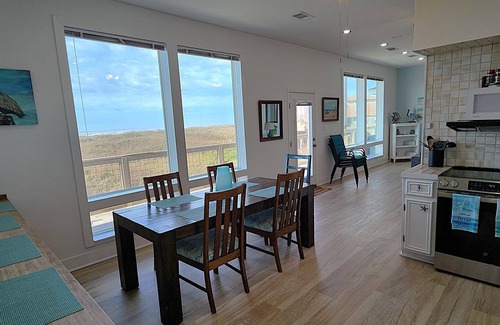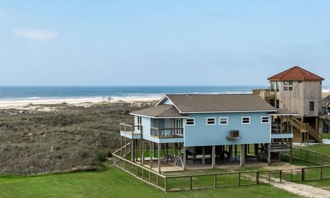 The home has a fully fenced yard and is pet-friendly (two dog limit), perfect for your four legged family members. Upstairs you will find two bedrooms equipped with Queen size beds and two bedrooms with a full/twin bunk bed setup. Both bathrooms feature a bathtub/ shower combo and downstairs you will find an outdoor shower perfect for rinsing the sand off your feet. Enjoy breakfast while watching the sunrise over the beach and take advantage of the fully stocked kitchen. The home has a smart TV and wifi available (Samsung TV Plus channels available). Every window in the living room and kitchen has stunning, unobstructed beachfront views. Spend your day on the private balcony enjoying the sea breeze, take a short stroll to the beach, or fish some of the best areas that the Texas coast offers.