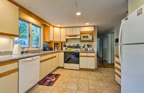 The hardwood floors throughout the large family room and kitchen exude elegance, while the bedrooms, two upstairs and two on the first floor, provide ample sleeping space. The home features new flooring and freshly painted walls, ensuring a cozy and refreshing stay. Stay connected with high-speed internet access and enjoy the convenience of central air conditioning and a gas grill.