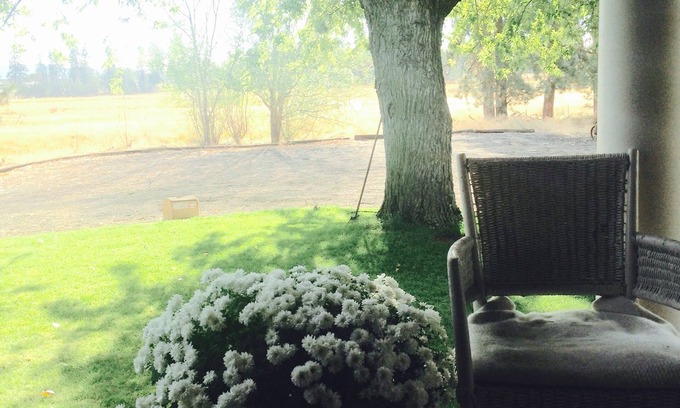 It sits on 12 gorgeous acres of county land with an in-ground cement pool, fire pit, hot tub, covered porch, barn with chickens and barn cats to enjoy feeding or petting. It has an open floor plan, fireplace, comfy TV room, high speed internet, large picture windows, modern kitchen with all of the amenities you would expect. Lots of room to spread out! We stay on property in our motorhome to take care of the property but we are not in the way. (large property) Come and enjoy a serene setting while being just 7 miles from all that goes on downtown.