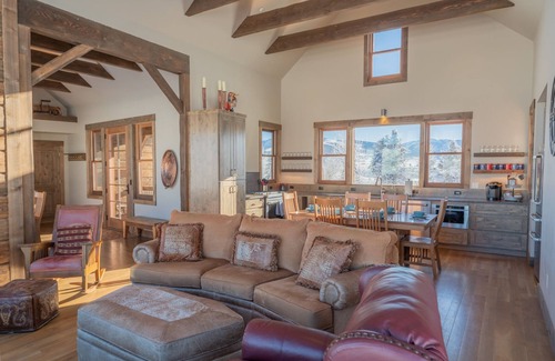 Upon entering the home, windows literally surround you, bringing the great Rocky Mountains inside. The heart of the home is comprised of an open concept living/dining area with an upgraded kitchen. The fully equipped kitchen has everything you need to cook as if you were at home! Enjoy the coziness of the remote-controlled gas fireplace while taking in the valley views from comfy leather chairs and couch. A large balcony, just off the living room, is the perfect place for capturing one of Crested Butte's magical sunsets, wildlife on the neighboring ranch, or watching paddleboarders and fly fishers enjoy the river. The split bedroom design, one on each end of the house, makes this home the perfect get away for two couples or two small families and is well-suited for four adults and up to three minors. The upstairs bedroom has a king bed, twin-over-full bunk bed, private full bath, closet, desk with chair, TV, leather couch, and private balcony overlooking the Slate River valley and Mt. Crested Butte. The master bedroom, on the main floor, offers stunning views of Whetstone Mountain and the Slate River valley. It features a California king bed, full bathroom, walk-in closet, and houses a full-sized washer and dryer. The entry deck is the perfect place to watch the sunrise each morning.