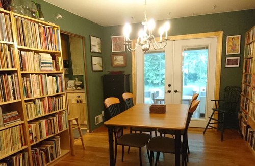 The kitchen is large and has everything you should need for your stay: refrigerator/freezer, microwave, dishwasher, coffee maker, blender, toaster, toaster oven, electric kettle, dishes, flatware, serving platters, pots and pans, baking supplies, and I generally have some cooking staples around such as seasonings, sugar, sweeteners, flour, pasta, dry beans, vegetable oil, and olive oil. The coffee nook has a drip coffee maker, an espresso machine, a coffee bean grinder, coffee beans, and a variety of tea.