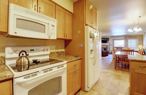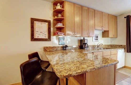 The townhome is thoughtfully designed with two levels, providing ample space and privacy. Upon entry, you’ll find a private two-car garage and a welcoming foyer with stairs leading to the main living area. The open-concept living space is perfect for relaxing and entertaining. The fully stocked kitchen features granite countertops, ample cookware, and a coffee maker, making it easy to prepare meals. Bar seating for two and a dining table that accommodates six ensure everyone can gather comfortably. The adjacent living room offers plush seating, including a leather recliner, loveseat, and a sofa that converts into a sleeper. Cozy up by the gas fireplace and enjoy your favorite shows or movies on the 65-inch smart TV. Just off the living room, a furnished balcony with Adirondack chairs and a gas grill invites you to unwind and take in the fresh mountain air. A convenient powder room is also located on this level.