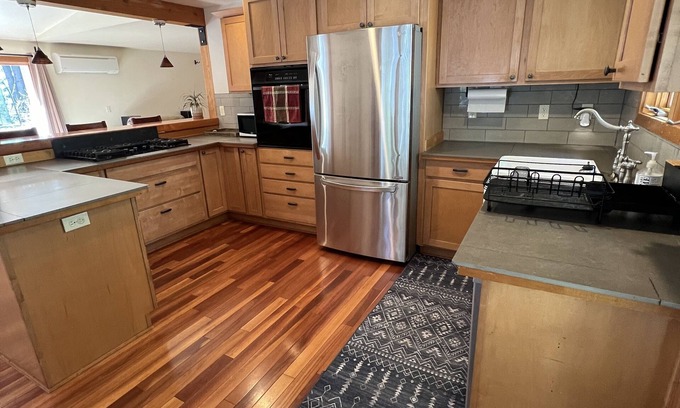 Our property is very quiet. The main house, this VRBO, is located at the bottom of the property, and the other three residences are located at the top of our 6 acre parcel. You will likely never see any of the residents, except when they pass by on the shared main driveway. The manager of the property lives in the cabin at the top of the property and he’s usually available through text or calls if you have an issue with something.