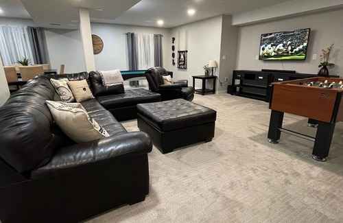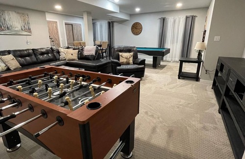 The home has plenty of space and areas for get together and relaxation for privacy as well. The home is entirely finished with alot of charm. Back yard for out door bbq with patio table and chaira or just sitting and relaxing inside from lower level playing pool or Foosball or watching movies or even board games.