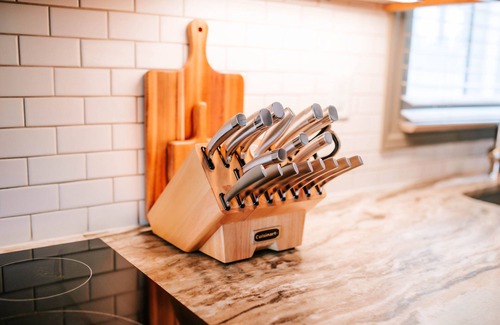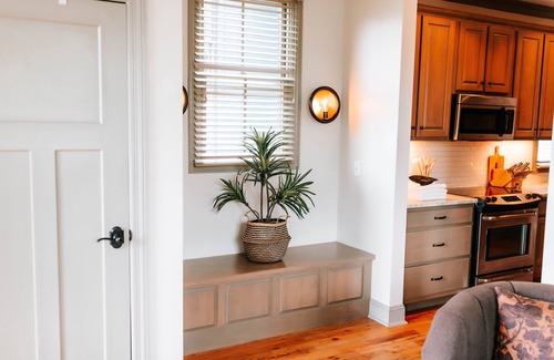 The modern galley style kitchen and dining area offer plenty of room to comfortably host intimate dinners and are outfitted with all the cookware, dishes, utensils, dishwasher pods, and appliances you will need to cook delicious meals. The inside dining table can seat up to four, and there is also dining seating for eight on the back porch.