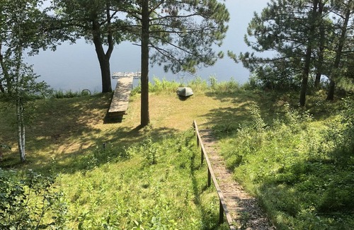 This is not a walkout to the lake as there are steps down. Good exercise and a beautiful view, but not good if you have bad knees. There's not much of a beach as it is pretty rock but usable. The water drops off quickly and is 5-6 ft deep at the end of the dock. There is a floating swim platform for your use. Bring mosquito repellent as some years they can be bad. In 2018 they were virtually non-existent but it depends on the spring weather.