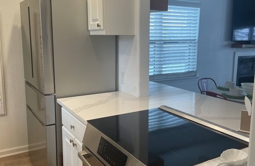 The living room features a wood burning fireplace (perfect for cozying up on the couch) and a big screen tv. The adjacent kitchen has a wine and breakfast bar, induction cooktop stove, and all of the appliances and cookware that you would need to whip up a gourmet meal!