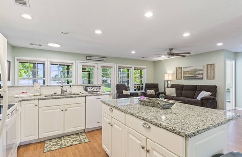 Large screen porch across the back of the house for enjoying the view with lounge area and dining table. Nice gentle sloping lot to the water that is great for the young and old. At the end of a slough with view down to big water makes for a nice swimming area and easy docking without boat traffic and wake. Steps into the water for easy swimming access and also a nice shallow beach area for the kids to play in the sand and water. Fire pit area and loungers at the dock. Plenty of room for parking. Bring your own boat and put in at boat ramp 5 minutes away and park your trailer at the house and boat at the dock. We also provide four adult kayaks and two kid kayaks and there are universal adult life vests but please bring correct size life vests for any kids.