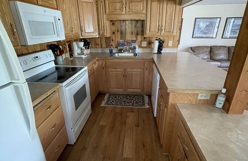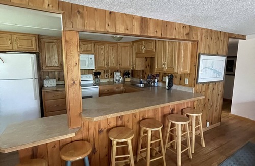 Our lake home will sleep up to 12 people with two double beds, 1 queen bed, 1 king, and two sets of twin bunk beds. There are two bath rooms, one shower.