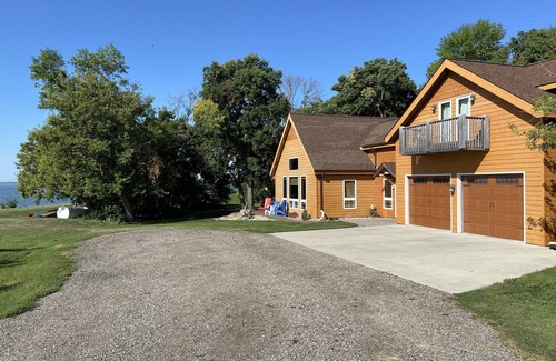 Lakefront home located right on the Minnewaukan flats with great fishing and recreation with beach, private dock, boat launch, playground and fish cleaning station. Located 13.5 miles west of devils lake on Hwy 19. Just across the road to pelican boat landing. Beautiful timber frame home with 2 master bed/baths and a guest bedroom and guest full bath. Spacious rooms with Beds to sleep 7 with space for more. Propane fireplace, glass top range, solid wood floors, vaulted ceiling. Outdoor concrete patio right on the water with outdoor seating, fire pit, and dining tables. Close access to great hunting and fishing. SnoBear available for rent, parked in the heated garage.