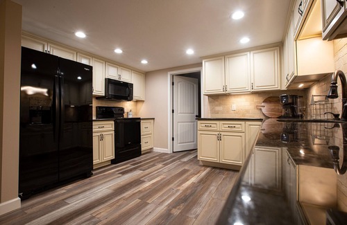 The main level has one king size bedroom, two queen-size bedrooms, and one king-size master suite with walk-in shower. There is a newly remodeled, full bath in the main level hallway. There is a large kitchen, fully equipped with everything you will need. The laundry room is right off the kitchen with a full sized washer and dryer. You'll love the open floorplan with a large dining table for 8 - 10 people.