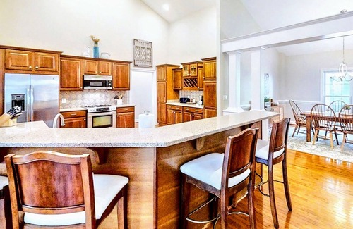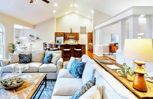This spacious home features 5 bedrooms, 3 full bathrooms, and an open living area designed for gathering and celebrating special occasions. The fully equipped kitchen is a chef’s dream, with an Instant Pot, crockpot, large stockpot, and plug-in griddle. Enjoy meals together at the large dining table or unwind in the great room with vaulted ceilings and cozy seating.