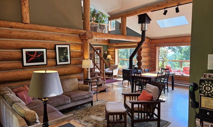 The whole group will be comfortable in this spacious and unique space. A beautiful light-filled log home with ocean view, hot tub, indoor and outdoor fireplace and in walking distance to Snug Cove with all its amenities. This wonderful cabin is one of Bowen Island's finest places to stay.
