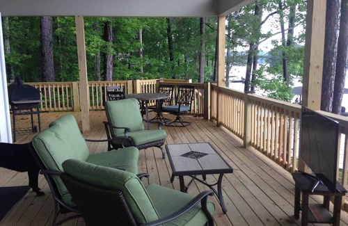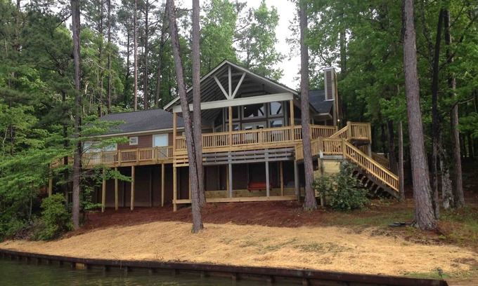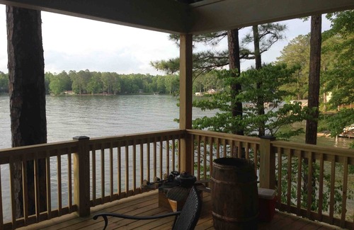 Open living area with large lakeside windows leading out to the covered deck enhance the beautiful view of the lake. Four spacious bedrooms, two with queen beds and two with king including a master suite with a separate bathroom and a door out to the deck. The loft above the living area has two full size fold out futon sofas for additional sleeping and the living area has one. Linens and kitchen equipment are provided. WiFi is available and there are three TV's - one in the master suite, one in the living area and a third that can be moved from the guest king out to the covered porch - perfect for game days. The dock has deep water for swimming and a boat lift (there is no private boat ramp - boats can be launched from nearby marinas the closest being 'Real Island.') Other items include a fireplace in the living area for winter rentals and a charcoal grill on the deck. The best feature is that pets are welcome inside and out!