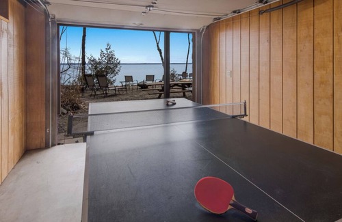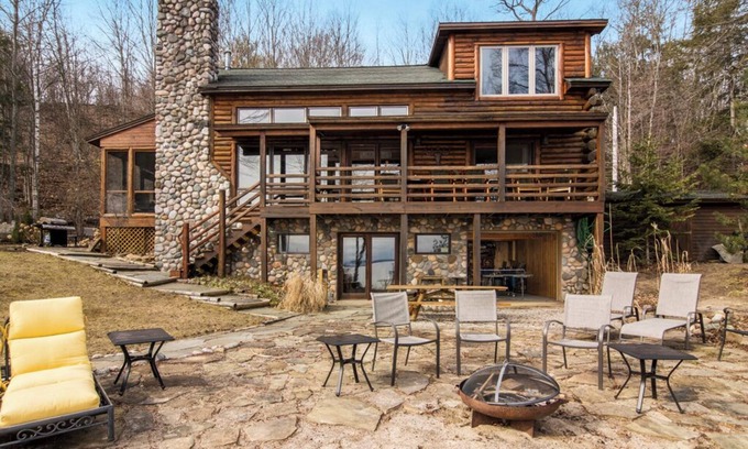 This beautiful, spacious, private log home features a dramatic cathedral ceiling in the living room, fieldstone fireplace, and spectacular views of the bay from both an outdoor balcony and screened-in porch. This comfortable resort home has four unique bedrooms and three full bathrooms. In addition, the property includes a separate “Rustic Lovers’ Retreat” sleeping cabin with knotty pine paneling. Nestled in the woods just a stone’s throw from the bay, it sleeps four. Imagine being lulled to sleep by the sound of the waves lapping on the shore. It's heaven on earth. A hammock perfect for afternoon daydreaming, a game room complete with ping pong table, a gorgeous sandy beach, and the finest dock in the entire Great Lakes complete this one-of-a-kind getaway.