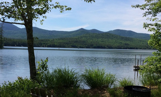 Spectacular views of the White Mountains greet you each day from the broad waterside deck of this special rental on beautiful Lower Kimball Pond (The Google Map illustration in VRBO is incorrect - house is less than 100 ft from the water.) Once part of a boy's camp in the 1940's the property extends to the water's edge where the sandy bottom is ideal for wading, before sloping gradually to deeper water and a common swimming raft. The private dock is a perfect place to read, relax, or launch off to adventures. A shared private sandy beach, basketball and tennis courts are a short walking distance. The house has the wonderful feel of a Maine camp; a wood beamed cathedral ceiling allows for a light filled experience in the large central living room featuring a working fieldstone fireplace and connected open kitchen. With three bedrooms and a loft, there are accommodations for ten, two full baths, a screened porch, and outdoor shower. A ping pong table, dart board, rowboat, canoe, and sit-upon kayak are downstairs ready for use. Amenities include washer and dryer, WiFi, plenty of parking and lots of board games!